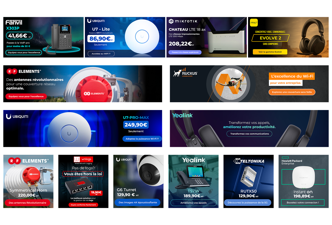 Wifi France souhaitait dynamiser ses ventes via des bannières performantes. L’analyse a rapidement révélé des points d’incohérence entre la promesse média et les pages d’atterrissage. Nous avons donc étendu le périmètre à une refonte légère des pages clés et à un gabarit newsletter.