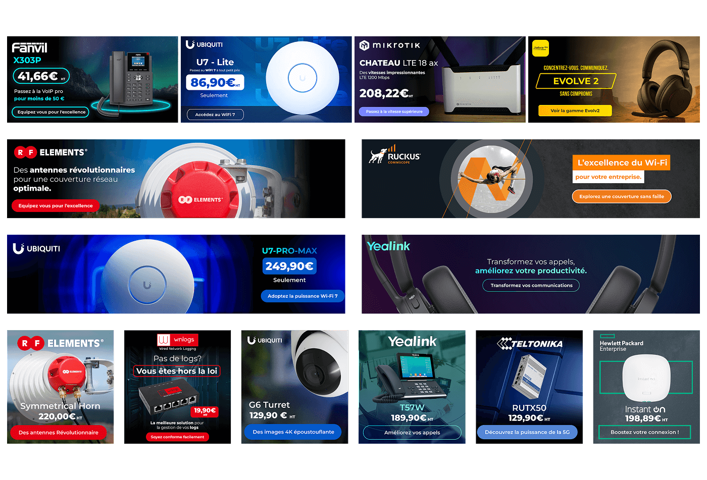 Visuels par familles de produits, formats IAB et réseaux.